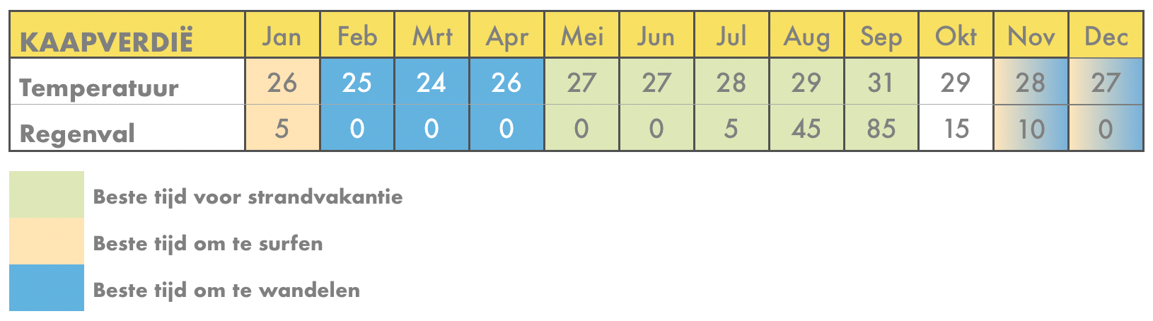 Het klimaat van Kaapverdië is gedurende het gehele jaar door vrijwel hetzelfde. Toch is het goed om te weten wat voor weer je per maand kunt verwachten, aangezien er toch kleine verschillen zijn tussen de diverse maanden van het jaar. In onderstaande tabel lees je meer over het weer in de verschillende maanden van het jaar, ofwel de beste reistijd per maand.